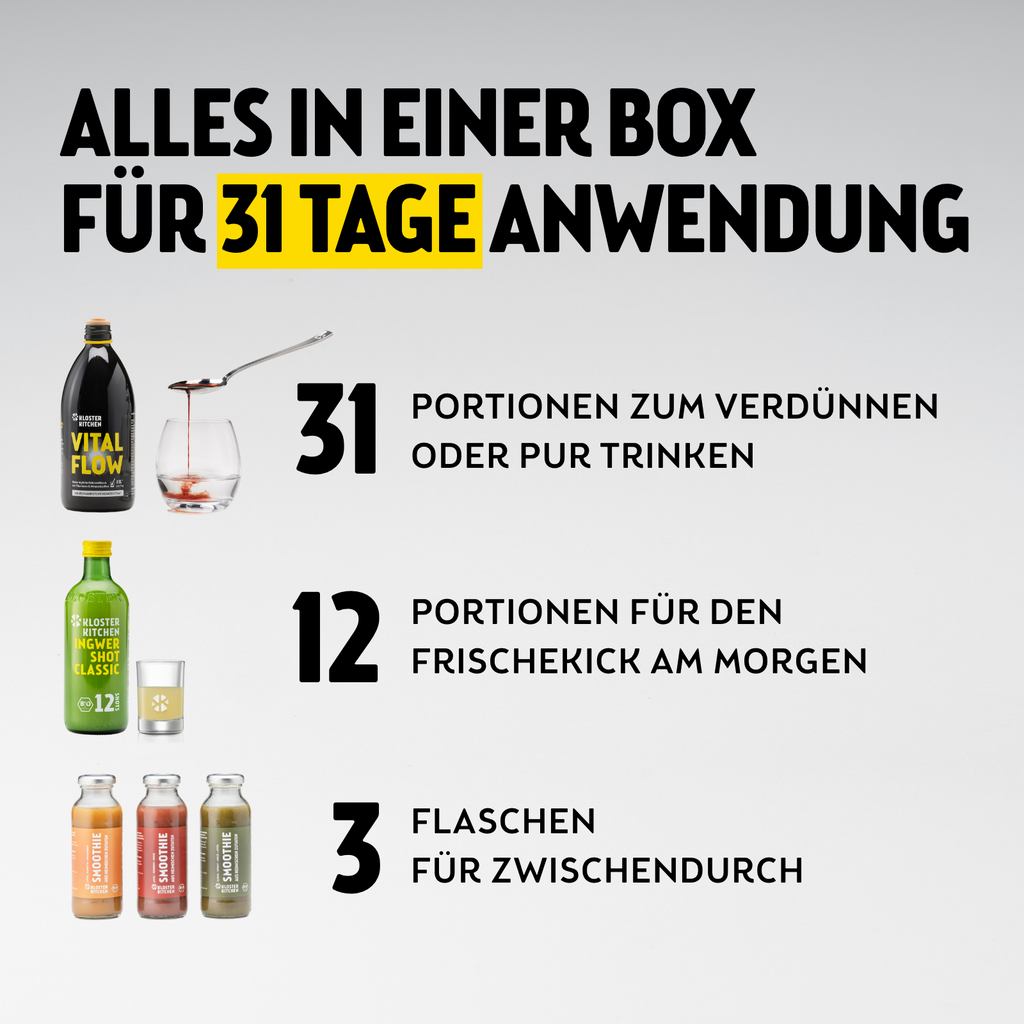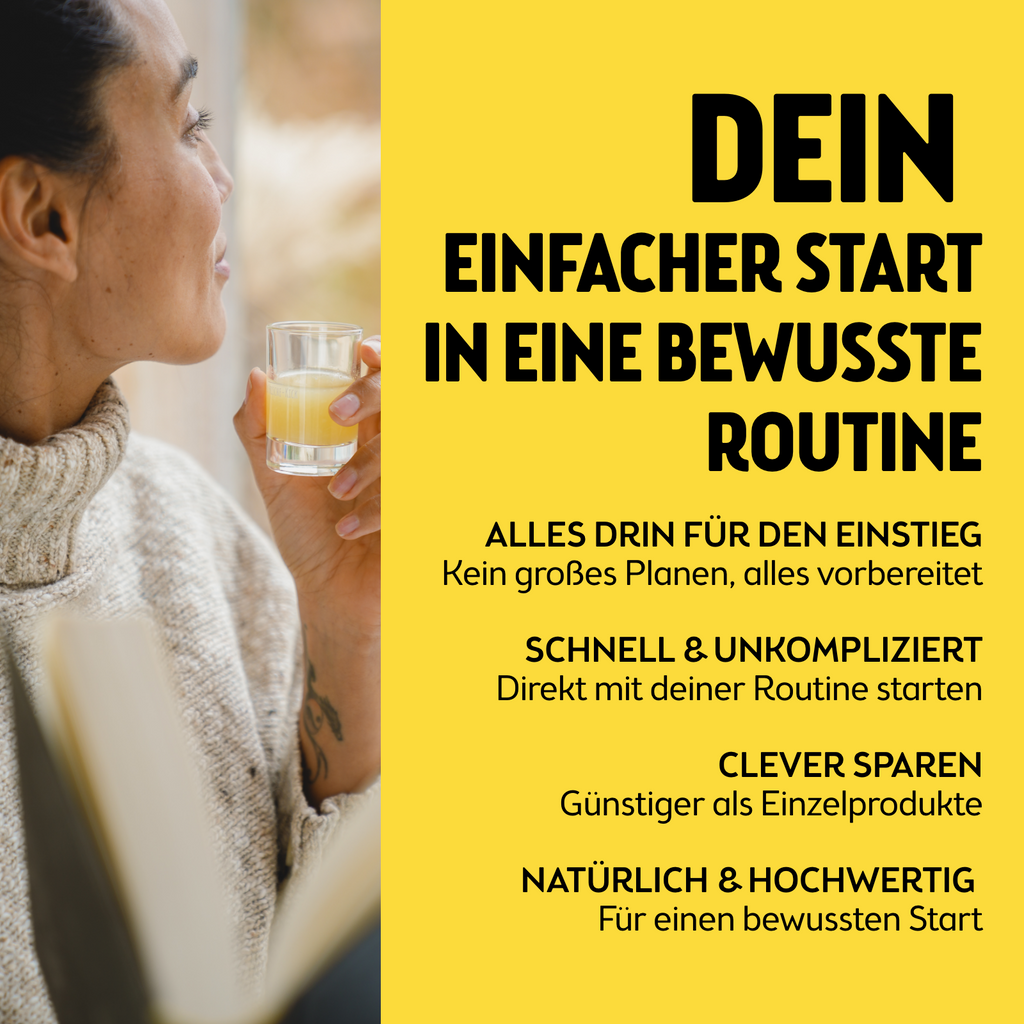 Iniziate la vostra routine consapevole senza pensieri: lo starter set contiene tutto il necessario per l'uso quotidiano. Ogni prodotto si integra perfettamente con gli altri, in modo che possiate sentire l'effetto completo fin dall'inizio. La quantità inclusa è sufficiente per circa 31 giorni, in modo da poter integrare facilmente la routine nella vostra vita quotidiana. Perfetto per tutti coloro che vogliono iniziare in modo consapevole e migliorare le proprie abitudini: rapido, semplice e sapientemente combinato.