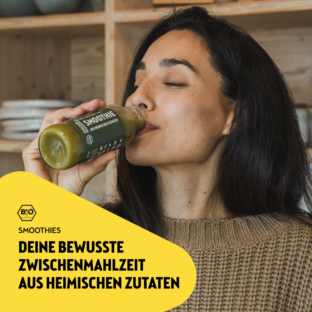 I nostri smoothies sono realizzati con ingredienti naturali, senza zuccheri aggiunti, biologici, vegani e confezionati in bottiglie di vetro. Perfetti come spuntino veloce e salutare tra un pasto e l'altro o come snack rinfrescante in viaggio. La combinazione di mele locali, carote, rabarbaro, fragole, pere, spinaci, menta e cetrioli garantisce un'esperienza di gusto armoniosa. Ideale per tutti coloro che tengono a una dieta sana e non vogliono rinunciare al gusto.