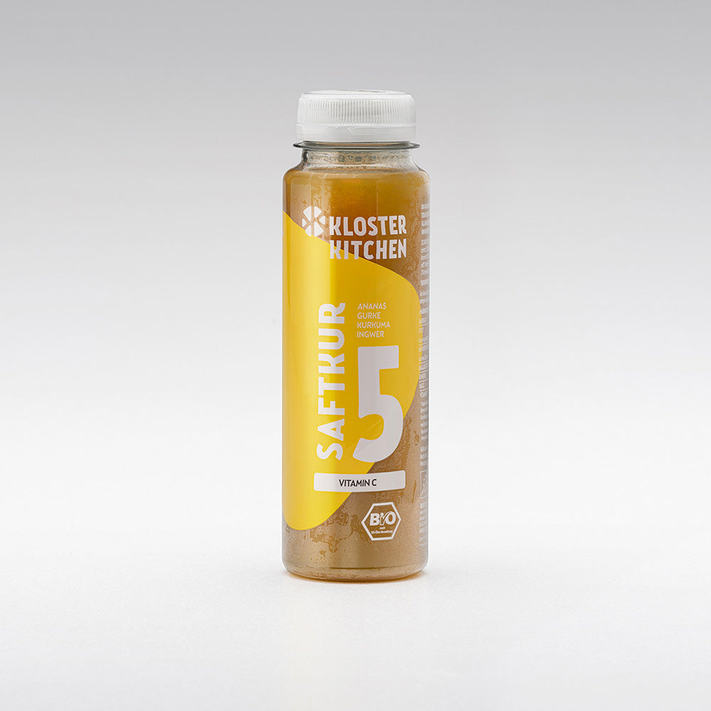 Miscela di succhi di frutta e verdura biologici: succhi di frutta, in parte da succhi concentrati di frutta (arancia, ananas, limone), succo di cetriolo, succo di curcuma e di zenzero
