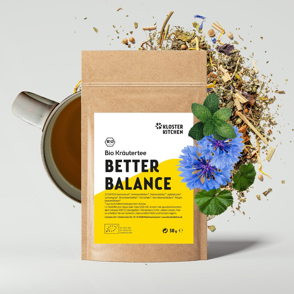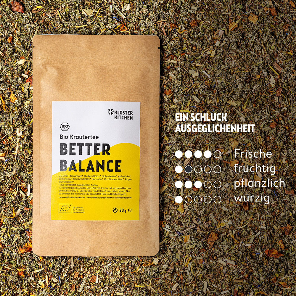 Better Balance è una tisana biologica composta da erbe biologiche accuratamente selezionate e tagliate grossolanamente. Non è aromatizzata e convince per il suo aroma naturale, delicato ed equilibrato, ideale per momenti di piacere consapevole nella vita quotidiana.